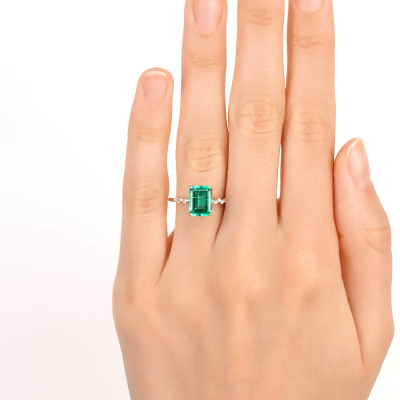 Кольцо с 1 изумрудом выращенным Колумбия, 1.99 карат; 8 бриллиантами выращенными, 0.07 карат, огранка круг 57 граней, цвет 3, чистота 5, тип огранки А; Желтое золото 585 пробы.