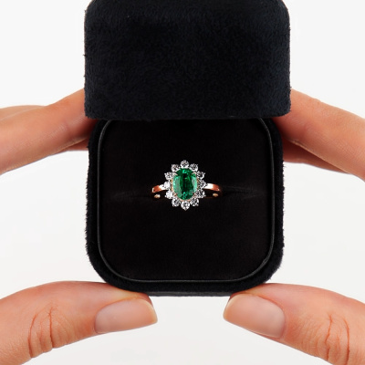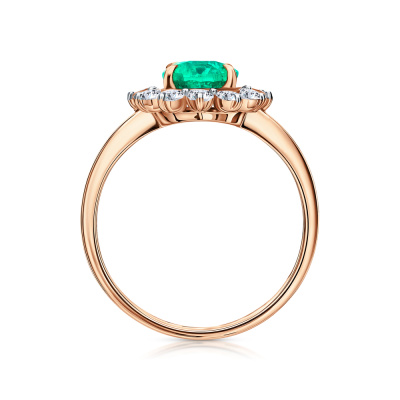 Кольцо с 1 изумрудом выращенным Колумбия, 1.01 карат; 12 бриллиантами выращенными, 0.49 карат, огранка круг 57 граней, цвет 3, чистота 5, тип огранки А; Розовое золото 585 пробы.