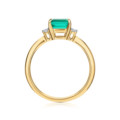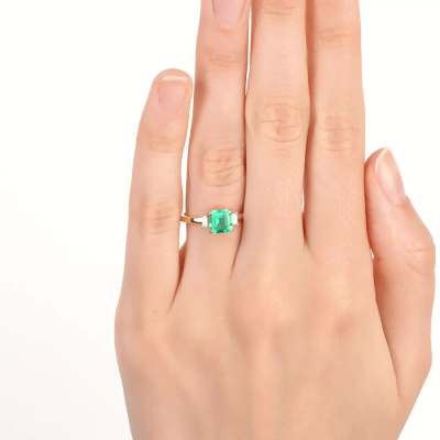 Кольцо с 1 изумрудом выращенным Колумбия, 0.91 карат; 2 бриллиантами выращенными, 0.1 карат, огранка багет 25 граней, цвет 3, чистота 5, тип огранки А; Желтое золото 585 пробы.