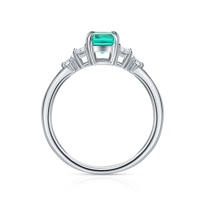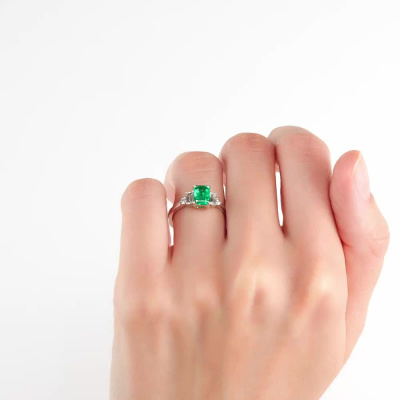 Кольцо с 1 изумрудом выращенным Колумбия, 0.81 карат; 2 бриллиантами выращенными, 0.23 карат, огранка багет 25 граней, цвет 3, чистота 5, тип огранки А; 2 бриллиантами выращенными, 0.08 карат, огранка круг 57 граней, цвет 3, чистота 5, тип огранки А; Белое золото 585 пробы.