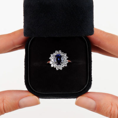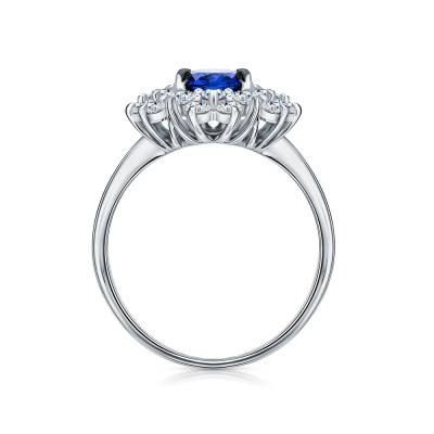 Кольцо с 1 сапфиром выращенным, 1.53 карат; 6 бриллиантами выращенными, 0.32 карат, огранка круг 57 граней, цвет 3, чистота 5, тип огранки А; 12 бриллиантами выращенными, 0.38 карат, огранка круг 57 граней, цвет 3, чистота 5, тип огранки А; 6 бриллиантами выращенными, 0.16 карат, огранка круг 57 граней, цвет 3, чистота 5, тип огранки А; Белое золото 585 пробы.