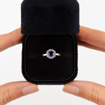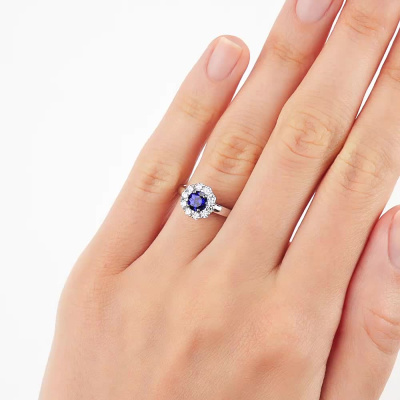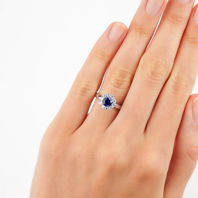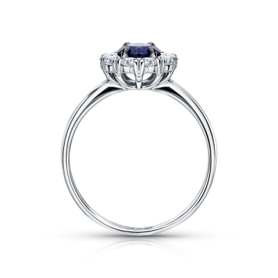Кольцо с 1 сапфиром выращенным, 0.62 карат; 10 бриллиантами выращенными, 0.31 карат, огранка круг 57 граней, цвет 3, чистота 5, тип огранки А; Белое золото 585 пробы.