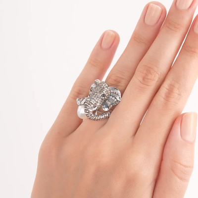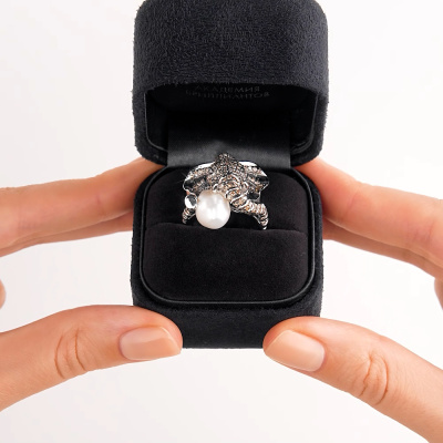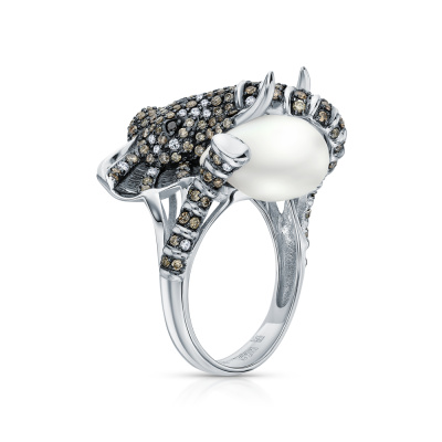 Кольцо с 1 жемчуом барочным культивированным белым, 6 карат, тип огранки А; 2 бриллиантами черными природными облагороженными, 0.01 карат, огранка круг 57 граней, цвет 7, чистота 6, тип огранки А; 62 бриллиантами коричневыми природными, 0.51 карат, огранка круг 57 граней, цвет 5, чистота 5, тип огранки А; 53 бриллиантами коричневыми природными, 0.28 карат, огранка круг 57 граней, цвет 7, чистота 6, тип огранки А; 75 бриллиантами коричневыми природными, 0.37 карат, огранка круг 57 граней, цвет 7, чистота 5, тип огранки А; 1 бриллиантом коричневым природным, 0.005 карат, огранка круг 57 граней, цвет 5, чистота 5, тип огранки А; Белое золото 585 пробы.