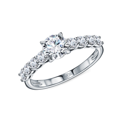 Кольцо с 1 бриллиантом выращенным, 1.05 карат, огранка круг 57 граней, цвет 4, чистота 5, тип огранки А; 8 бриллиантами выращенными, 0.662 карат, огранка круг 57 граней, цвет 3, чистота 5, тип огранки А; Белое золото 585 пробы.