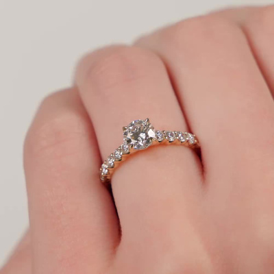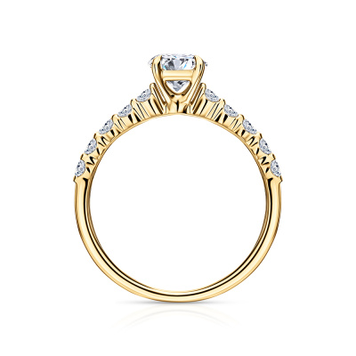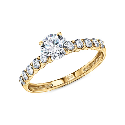 Кольцо с 1 бриллиантом выращенным, 0.81 карат, огранка круг 57 граней, цвет 4, чистота 5, тип огранки А; 10 бриллиантами выращенными, 0.39 карат, огранка круг 57 граней, цвет 3, чистота 5, тип огранки А; Желтое золото 585 пробы.