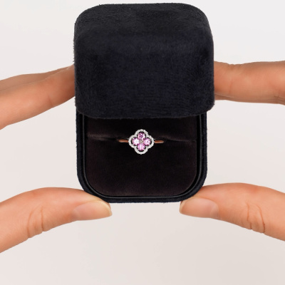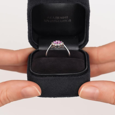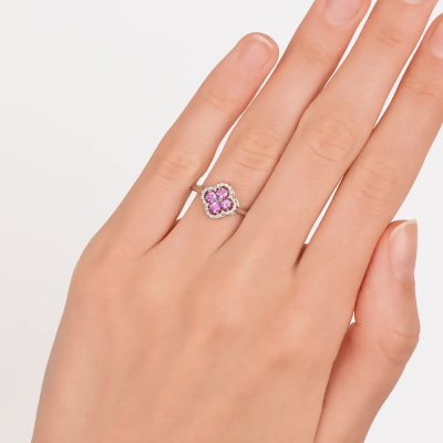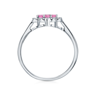 Кольцо с 24 бриллиантами природными, 0.06 карат, огранка круг 17 граней, цвет 2, чистота 2, тип огранки А; 4 сапфирами розовыми природными, 0.39 карат, тип огранки В; Белое золото 585 пробы.