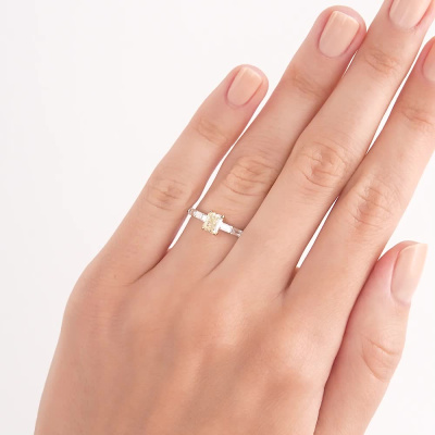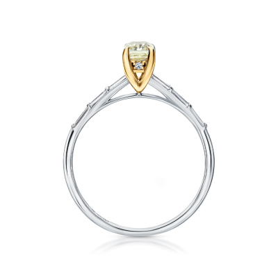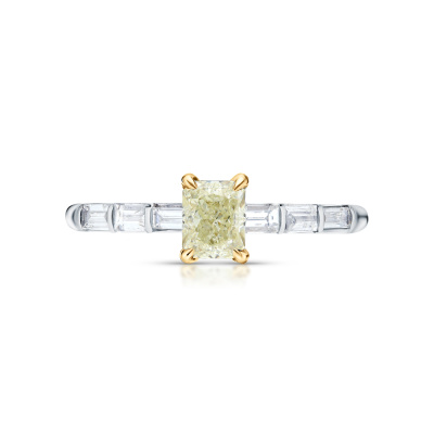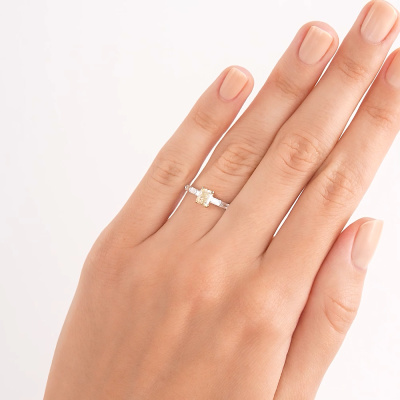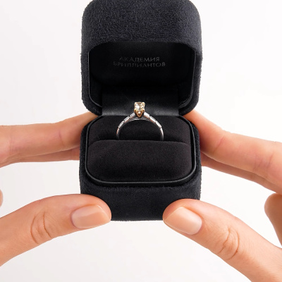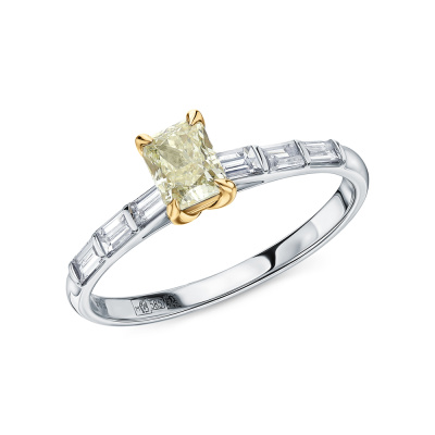 Кольцо с 1 бриллиантом природным, 0.6 карат, цвет 8-2, чистота 7, тип огранки А; 6 бриллиантами природными, 0.29 карат, огранка багет 33 грани, цвет 3, чистота 4, тип огранки А; 6 бриллиантами природными, 0.03 карат, огранка круг 57 граней, цвет 3, чистота 4, тип огранки А; Белое золото 585 пробы.