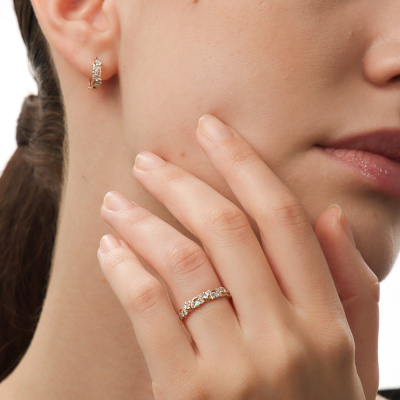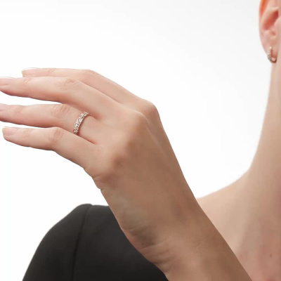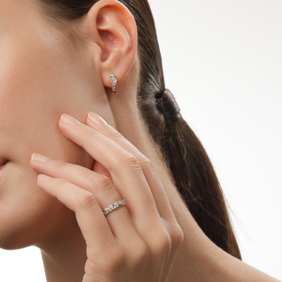 Кольцо с 21 бриллиантом природным, 0.09 карат, огранка круг 17 граней, цвет 2, чистота 2, тип огранки А; Розовое и белое золото 585 пробы.