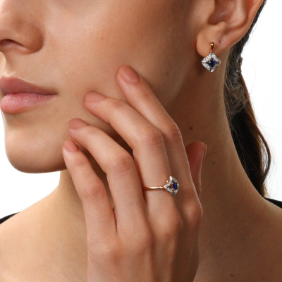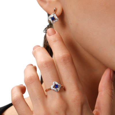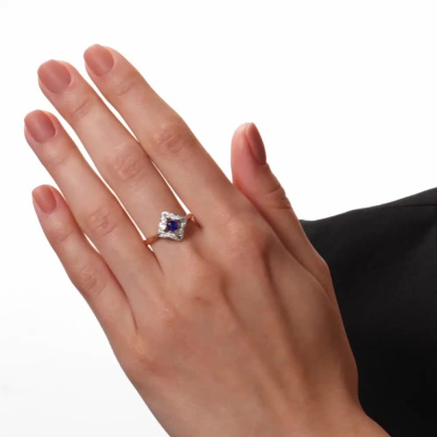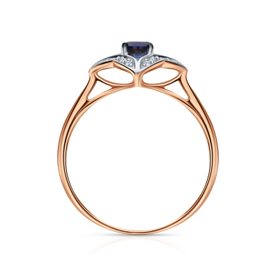 Кольцо с 8 бриллиантами природными, 0.06 карат, огранка круг 57 граней, цвет 3, чистота 6; 8 бриллиантами природными, 0.03 карат, огранка круг 17 граней, цвет 2, чистота 2; 1 сапфиром синтетическим, 0.3 карат; Розовое золото 585 пробы.