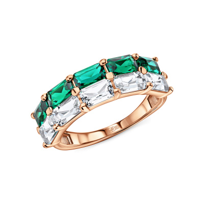 Кольцо с 5 топазами бесцветными природными, 1.81 карат; 5 гидротермальными изумрудами, 1.21 карат; Розовое золото 585 пробы.