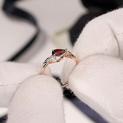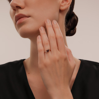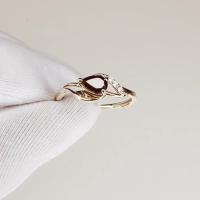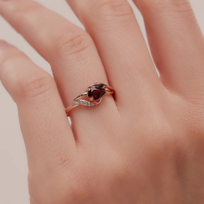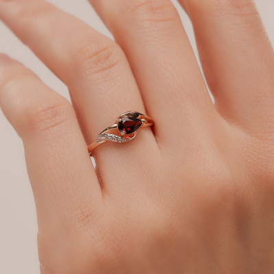 Кольцо с 3 бриллиантами природными, 0.02 карат, огранка круг 57 граней, цвет 3, чистота 6, тип огранки А; 1 гранатом природным, 0.48 карат; Розовое золото 585 пробы.