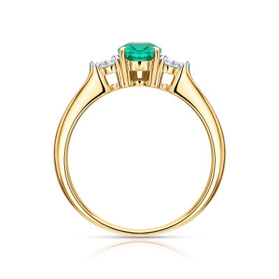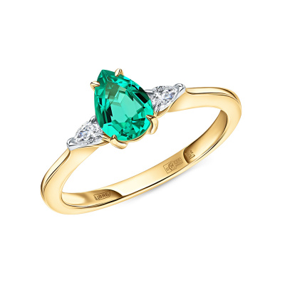 Кольцо с 1 изумрудом выращенным Колумбия, 0.62 карат; 2 бриллиантами выращенными, 0.09 карат, огранка груша 56 граней, цвет 3, чистота 5, тип огранки А; Желтое золото 585 пробы.
