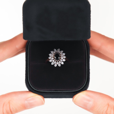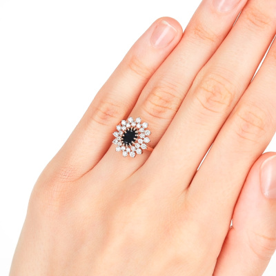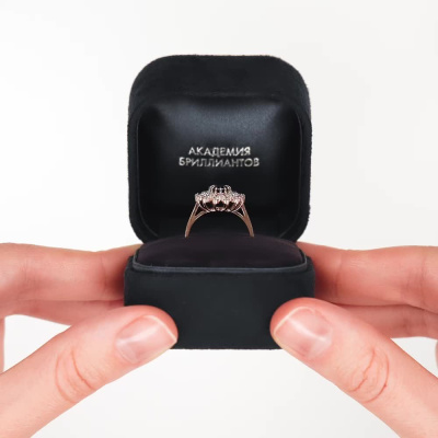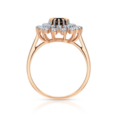 Кольцо с 14 бриллиантами природными, 0.35 карат, огранка круг 57 граней, цвет 3, чистота 6, тип огранки А; 14 бриллиантами природными, 0.22 карат, огранка круг 57 граней, цвет 3, чистота 6, тип огранки А; 1 сапфиром природным, 1.03 карат, цвет 2, чистота 2, тип огранки Б; Розовое золото 585 пробы.