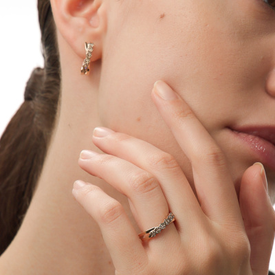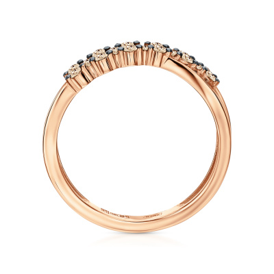 Кольцо с 5 бриллиантами коньячными природными, 0.11 карат, огранка круг 57 граней, цвет 7, чистота 6, тип огранки А; 12 бриллиантами коньячными природными, 0.18 карат, огранка круг 57 граней, цвет 7, чистота 6, тип огранки А; Розовое золото 585 пробы.