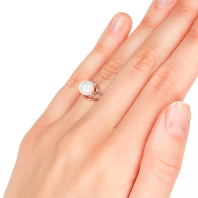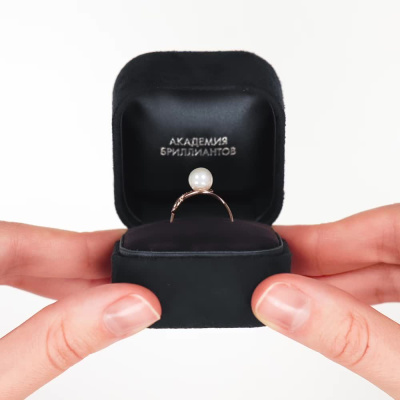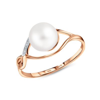 Кольцо с 5 бриллиантами природными, 0.02 карат, огранка круг 17 граней, цвет 2, чистота 2, тип огранки А; 1 жемчугом пресноводным культивированным белым; Розовое золото 585 пробы.