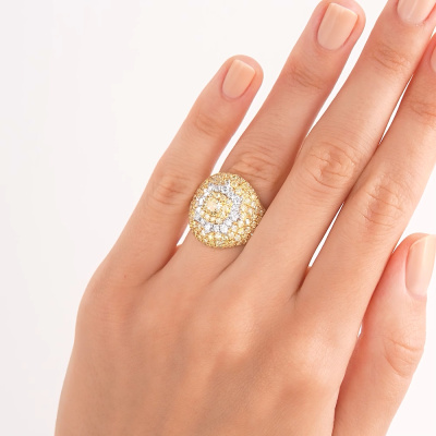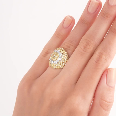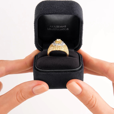 Кольцо с 1 бриллиантом природным, 0.42 карат, цвет 8-1, чистота 6, тип огранки А; 16 бриллиантами природными, 0.47 карат, огранка круг 57 граней, цвет 3, чистота 6, тип огранки А; 138 бриллиантами природными, 2.8 карат, огранка круг 57 граней, цвет 7, чистота 6, тип огранки А; Желтое золото 750 пробы.