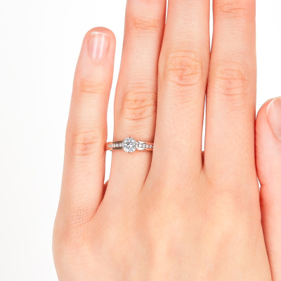 Кольцо с 1 бриллиантом выращенным, 0.5 карат, огранка круг 57 граней, цвет 4, чистота 5, тип огранки А; 10 бриллиантами выращенными, 0.07 карат, огранка круг 57 граней, цвет 3, чистота 5, тип огранки А; Белое золото 585 пробы.