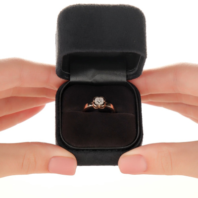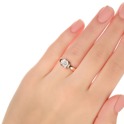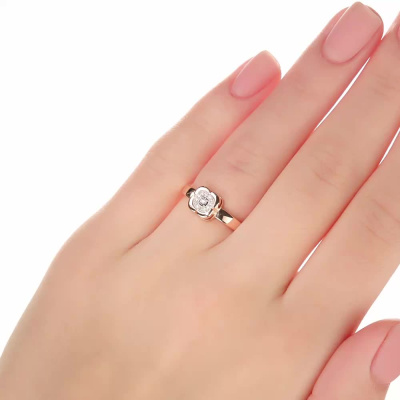 Кольцо с 1 бриллиантом природным, 0.004 карат, огранка круг 57 граней, цвет 3, чистота 6, тип огранки А; 12 бриллиантами природными, 0.03 карат, огранка круг 17 граней, цвет 2, чистота 2, тип огранки А; Розовое и белое золото 585 пробы.