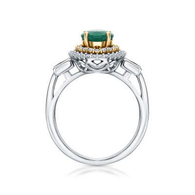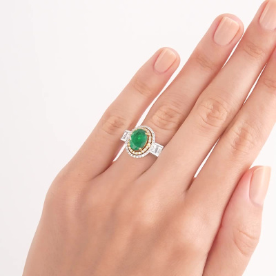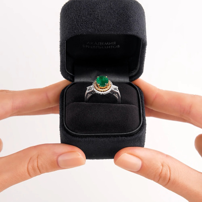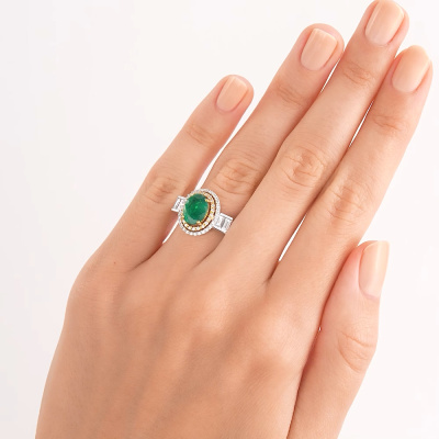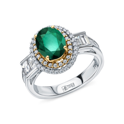 Кольцо с 12 бриллиантами природными, 0.85 карат, огранка багет 33 грани, цвет 3, чистота 4, тип огранки А; 52 бриллиантами природными, 0.21 карат, огранка круг 57 граней, цвет 3, чистота 5, тип огранки А; 1 изумрудом природным, 1.56 карат, цвет 3, чистота 3, тип огранки Б; Белое золото 750 пробы.