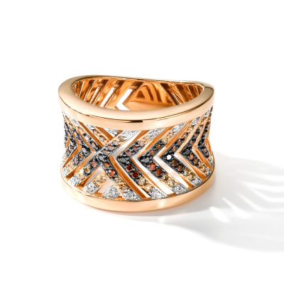 Кольцо с 20 бриллиантами природными, 0.09 карат, огранка круг 57 граней, цвет 4, чистота 5, тип огранки А; 9 бриллиантами черными природными облагороженными, 0.05 карат, огранка круг 57 граней, цвет 7, чистота 6, тип огранки А; 44 бриллиантами коньячными природными, 0.26 карат, огранка круг 57 граней, цвет 7, чистота 6, тип огранки А; 38 бриллиантами коричневыми природнымиоблагороженными, 0.22 карат, огранка круг 17 граней, цвет 5, чистота 4; Розовое золото 585 пробы.