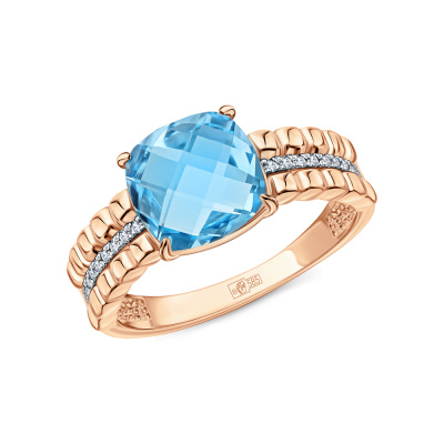 Кольцо с 18 бриллиантами природными, 0.06 карат, огранка круг 17 граней, цвет 2, чистота 2, тип огранки А; 1 топазом свисс природным, 2.77 карат; Розовое золото 585 пробы.