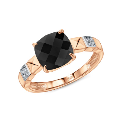 Кольцо с 8 бриллиантами природными, 0.03 карат, огранка круг 17 граней, цвет 2, чистота 2, тип огранки А; 1 ониксом черным природным; Розовое золото 585 пробы.