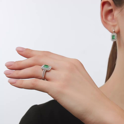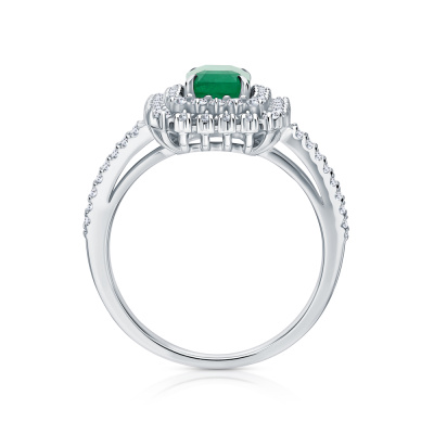 Кольцо с 22 бриллиантами природными, 0.24 карат, огранка круг 57 граней, цвет 3, чистота 6, тип огранки А; 18 бриллиантами природными, 0.16 карат, огранка круг 57 граней, цвет 3, чистота 6, тип огранки А; 32 бриллиантами природными, 0.11 карат, огранка круг 17 граней, цвет 2, чистота 2, тип огранки А; 1 изумрудом природным, 0.89 карат, цвет 3, чистота 3, тип огранки Б; Белое золото 585 пробы.