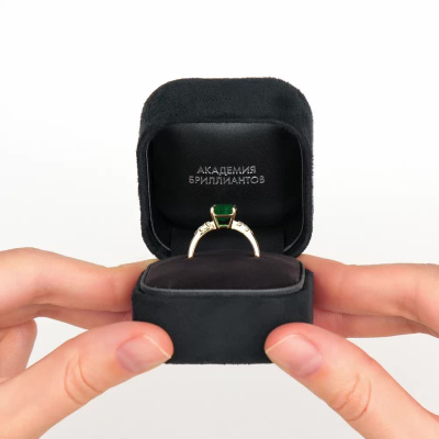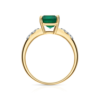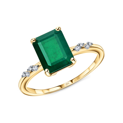 Кольцо с 8 бриллиантами природными, 0.06 карат, огранка круг 57 граней, цвет 3, чистота 6, тип огранки А; 1 изумрудом природным, 2.24 карат, цвет 4, чистота 3, тип огранки Б; Желтое золото 585 пробы.