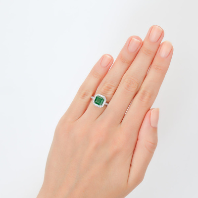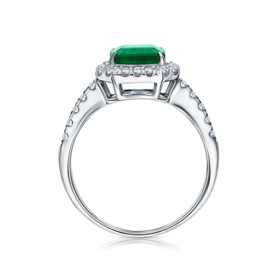 Кольцо с 30 бриллиантами природными, 0.27 карат, огранка круг 57 граней, цвет 3, чистота 6, тип огранки А; 1 изумрудом природным, 1.76 карат, цвет 3, чистота 3, тип огранки Б; Белое золото 585 пробы.