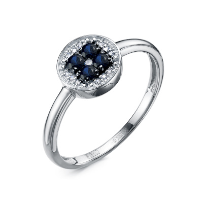 Кольцо с 1 бриллиантом природным, 0.007 карат, огранка круг 57 граней, цвет 3, чистота 6, тип огранки А; 12 бриллиантами природными, 0.02 карат, огранка круг 17 граней, цвет 2, чистота 3, тип огранки А; 4 сапфирами природными, 0.16 карат, цвет 2, чистота 2, тип огранки Б; Белое золото 585 пробы.