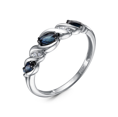 Кольцо с 6 бриллиантами природными, 0.01 карат, огранка круг 17 граней, цвет 2, чистота 3, тип огранки А; 3 сапфирами природными, 0.41 карат, цвет 2, чистота 2, тип огранки Б; Белое золото 585 пробы.
