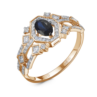 Кольцо с 6 бриллиантами природными, 0.138 карат, огранка круг 57 граней, цвет 3, чистота 6, тип огранки А; 4 бриллиантами природными, 0.061 карат, огранка круг 57 граней, цвет 3, чистота 6, тип огранки А; 56 бриллиантами природными, 0.229 карат, огранка круг 17 граней, цвет 2, чистота 3, тип огранки А; 1 сапфиром природным, 0.601 карат, цвет 2, чистота 2, тип огранки Б; Розовое золото 585 пробы.