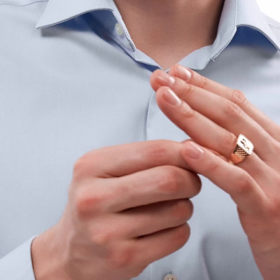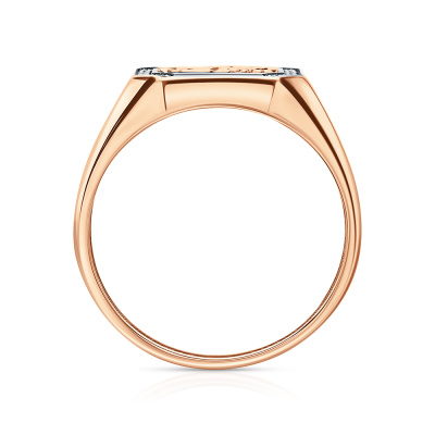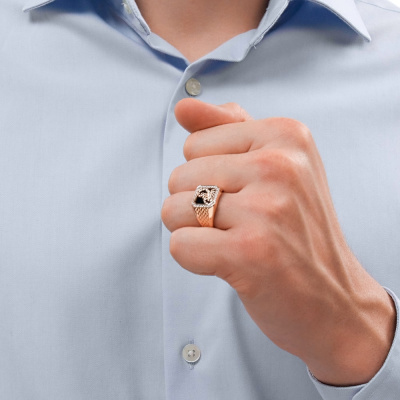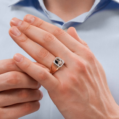 Кольцо с 32 бриллиантами природными, 0.136 карат, огранка круг 17 граней, цвет 2, чистота 2; 1 ониксом черным природным, 1.72 карат; Розовое золото 585 пробы.