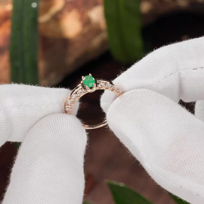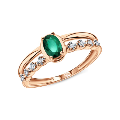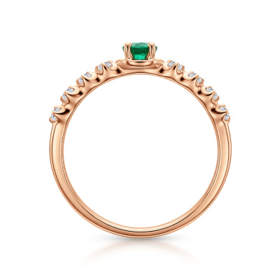 Кольцо с 8 бриллиантами природными, 0.067 карат, огранка круг 57 граней, цвет 3, чистота 6, тип огранки А; 1 изумрудом природным, 0.408 карат, цвет 3, чистота 3, тип огранки В; Розовое золото 585 пробы.