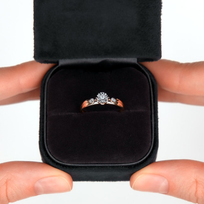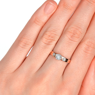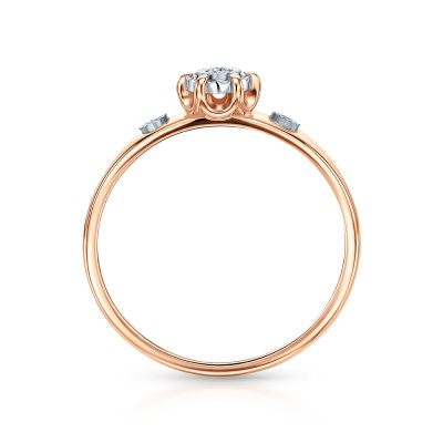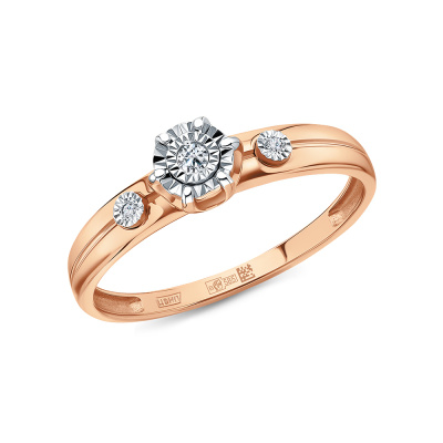 Кольцо с 1 бриллиантом природным, 0.02 карат, огранка круг 57 граней, цвет 3, чистота 6, тип огранки А; 2 бриллиантами природными, 0.007 карат, огранка круг 17 граней, цвет 2, чистота 2, тип огранки А; Розовое и белое золото 585 пробы.