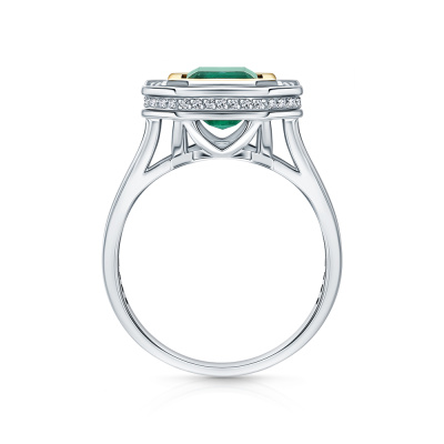 Кольцо с 56 бриллиантами природными, 0.26 карат, огранка круг 17 граней, цвет 2, чистота 2, тип огранки А; 86 бриллиантами природными, 0.17 карат, огранка круг 17 граней, цвет 2, чистота 2, тип огранки А; 1 изумрудом природным, 2.37 карат, цвет 4, чистота 3, тип огранки Б; Желтое и белое золото 585 пробы.