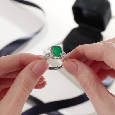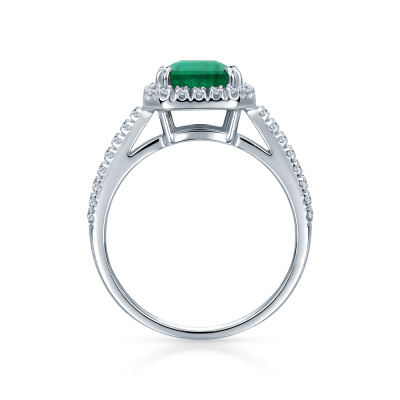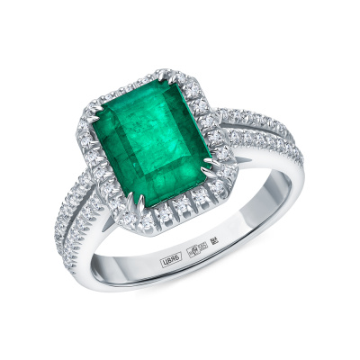 Кольцо с 56 бриллиантами природными, 0.42 карат, огранка круг 57 граней, цвет 3, чистота 6, тип огранки А; 1 изумрудом природным, 3.3 карат, цвет 3, чистота 3, тип огранки Б; Белое золото 585 пробы.