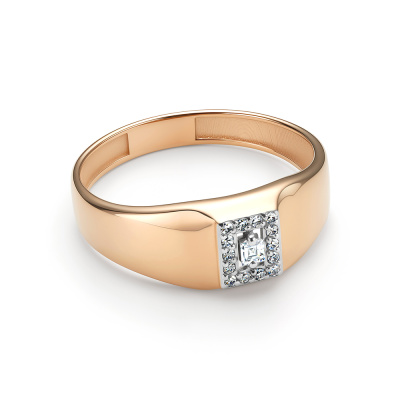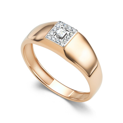 Кольцо с 1 бриллиантом природным, 0.02 карат, огранка багет 25 граней, цвет 3, чистота 5, тип огранки А; 14 бриллиантами природными, 0.05 карат, огранка круг 17 граней, цвет 2, чистота 3, тип огранки А; Розовое золото 585 пробы.