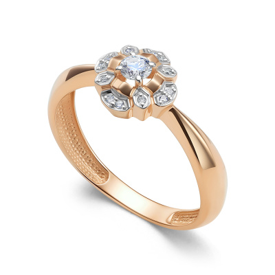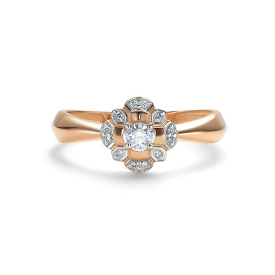 Кольцо с 1 бриллиантом природным, 0.13 карат, огранка круг 57 граней, цвет 4, чистота 5, тип огранки А; 12 бриллиантами природными, 0.03 карат, огранка круг 57 граней, цвет 4, чистота 5, тип огранки А; Розовое золото 585 пробы.