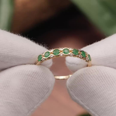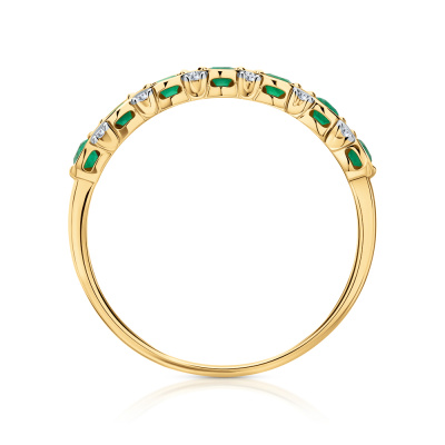 Кольцо с 12 бриллиантами природными, 0.05 карат, огранка круг 17 граней, цвет 2, чистота 2, тип огранки А; 7 изумрудами природными, 0.42 карат, цвет 3, чистота 3, тип огранки В; Желтое золото 585 пробы.