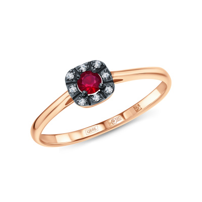 Кольцо с 1 рубином природным, 0.12 карат, цвет 2, чистота 2, тип огранки В; 8 бриллиантами коньячными природными, 0.02 карат, огранка круг 57 граней, цвет 7, чистота 5, тип огранки А; Розовое золото 585 пробы.