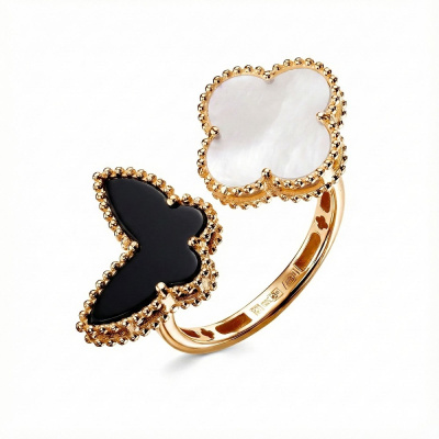 Кольцо с 1 перламутром белым природным, 2.45 карат; 1 ониксом черным природным, 1.925 карат; Розовое золото 585 пробы.