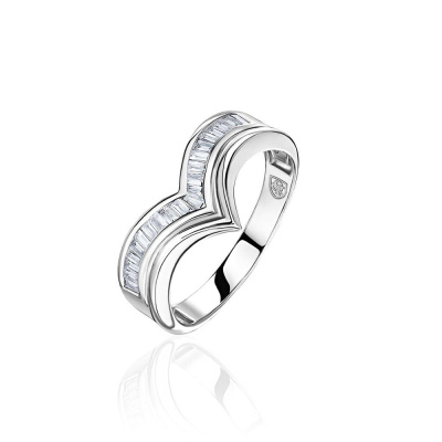 Кольцо с 3 бриллиантами природными, 0.06 карат, огранка багет 25 граней, цвет 3, чистота 5, тип огранки А; 10 бриллиантами природными, 0.18 карат, огранка багет 33 грани, цвет 3, чистота 5, тип огранки А; 8 бриллиантами природными, 0.13 карат, огранка багет 25 граней, цвет 3, чистота 5, тип огранки А; Белое золото 585 пробы.
