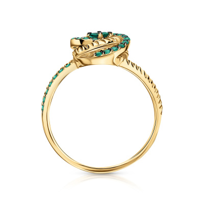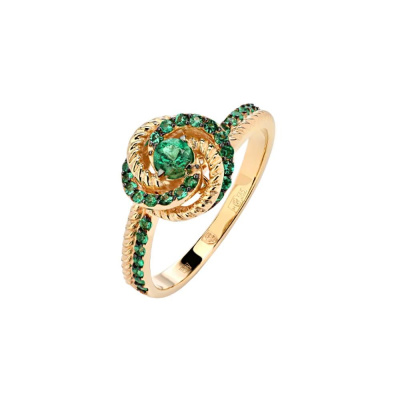 Кольцо с 1 изумрудом природным, 0.12 карат, цвет 3, чистота 2; 34 изумрудами природными, 0.18 карат, цвет 3, чистота 2; Желтое золото 585 пробы.
