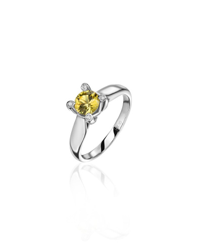 Кольцо с 4 бриллиантами природными, 0.03 карат, огранка круг 57 граней, цвет 1, чистота 4, тип огранки А; сапфир желтый природный, 0.89 карат; Белое золото 585 пробы.