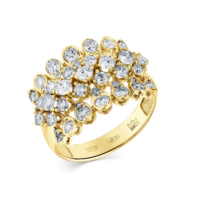 Кольцо с 5 бриллиантами природными, 0.39 карат, огранка круг 57 граней, цвет 3, чистота 5, тип огранки А; 6 бриллиантами природными, 0.33 карат, огранка круг 57 граней, цвет 3, чистота 5, тип огранки А; 14 бриллиантами природными, 0.61 карат, огранка круг 57 граней, цвет 3, чистота 5, тип огранки А; 4 бриллиантами природными, 0.13 карат, огранка круг 57 граней, цвет 3, чистота 5, тип огранки А; 4 бриллиантами природными, 0.1 карат, огранка круг 57 граней, цвет 3, чистота 5, тип огранки А; 6 бриллиантами природными, 0.04 карат, огранка круг 57 граней, цвет 3, чистота 5, тип огранки А; 8 бриллиантами природными, 0.02 карат, огранка круг 57 граней, цвет 3, чистота 5, тип огранки А; Желтое золото 585 пробы.