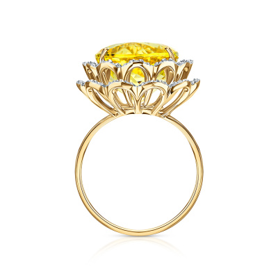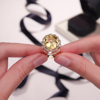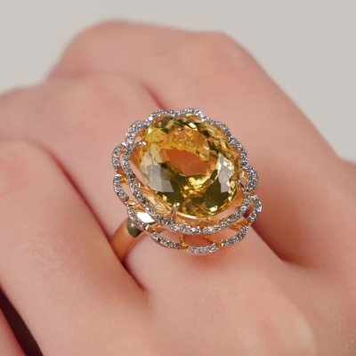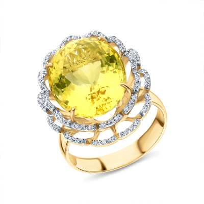 Кольцо с 72 бриллиантами природными, 0.28 карат, огранка круг 57 граней, цвет 3, чистота 5, тип огранки А; 1 бериллом, 11.94 карат, тип огранки Б; Желтое золото 585 пробы.