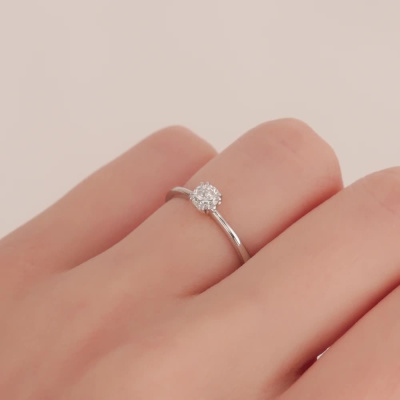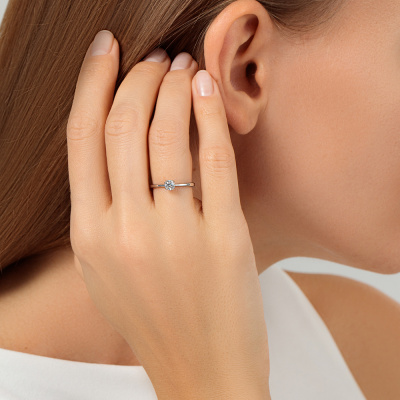 Кольцо с 1 бриллиантом природным, 0.28 карат, огранка круг 57 граней, цвет 3, чистота 6, тип огранки А; 2 бриллиантами природными, 0.006 карат, огранка круг 57 граней, цвет 3, чистота 6, тип огранки А; Белое золото 585 пробы.