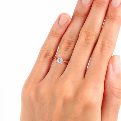 Кольцо с 1 бриллиантом природным, 0.046 карат, огранка круг 57 граней, цвет 3, чистота 5, тип огранки А; 6 бриллиантами природными, 0.063 карат, огранка круг 57 граней, цвет 3, чистота 5, тип огранки А; 6 бриллиантами природными, 0.021 карат, огранка круг 57 граней, цвет 3, чистота 5, тип огранки А; Розовое золото 585 пробы.