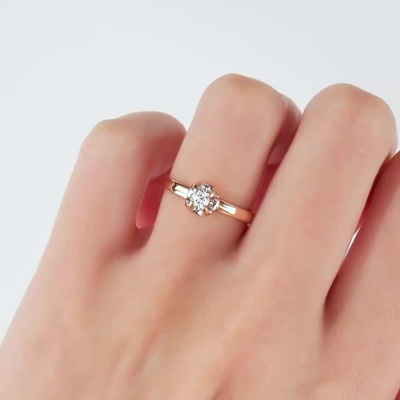 Кольцо с 1 бриллиантом природным, 0.11 карат, огранка круг 57 граней, цвет 4, чистота 6, тип огранки А; Розовое золото 585 пробы.
